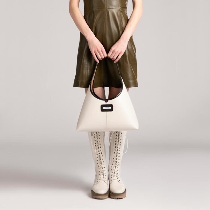 Versatile and minimally designed in a curved silhouette. Hobo is made from smooth Italian leather detailed with contrasting black leather trim. Sleek interior is lined in micro suede textile. The stud closure at the top keeps your belongings secure. It comes with a detachable pouch, which is perfect for securing smaller essentials. This medium sized version is large enough to hold all of your essentials, plus a book or tablet.